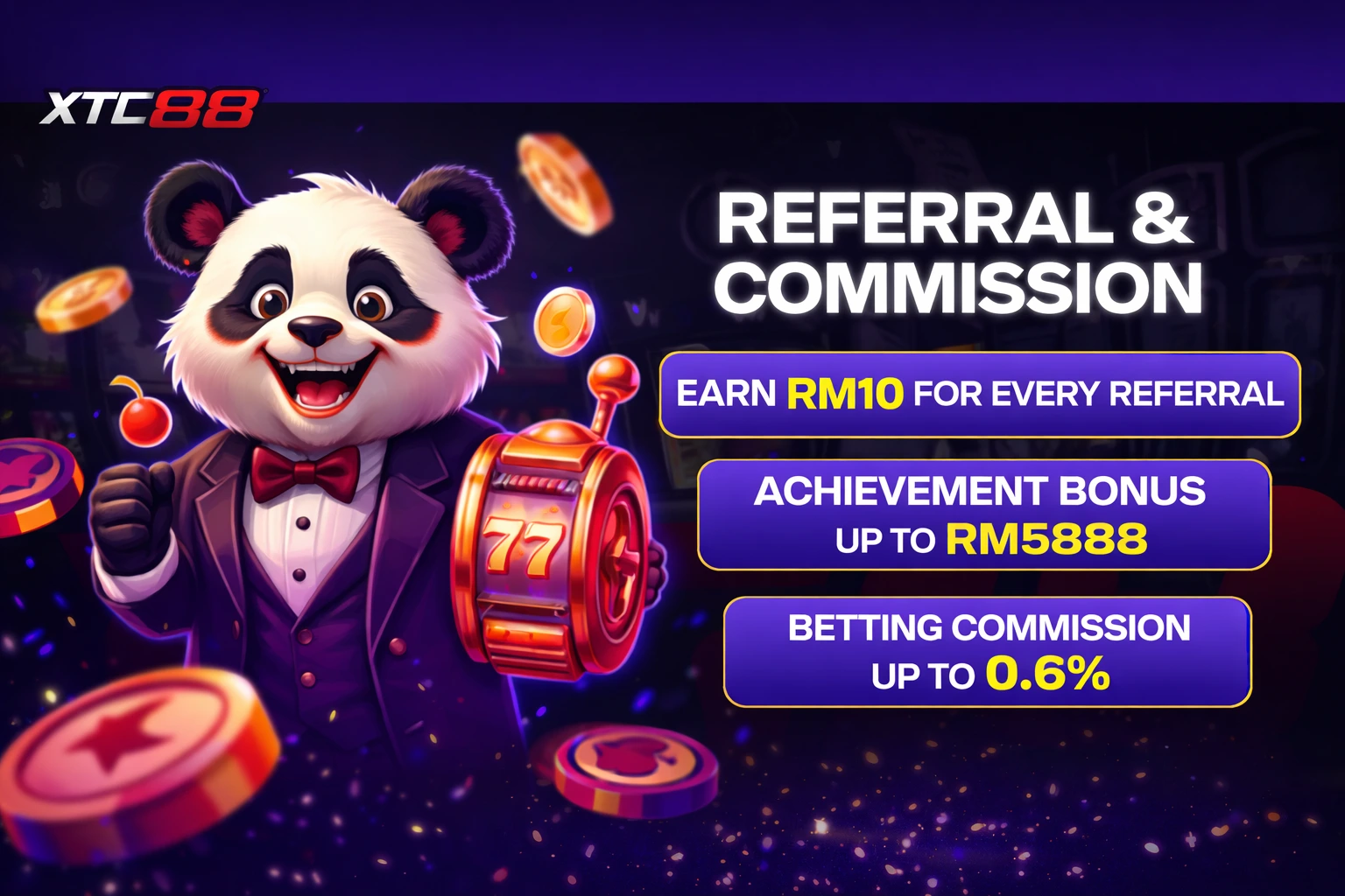 XTC88’s referral program is one of the most rewarding in the Malaysia online casino space. It runs on a 3-tier commission structure meaning you don’t just earn once. You keep earning as your network grows.